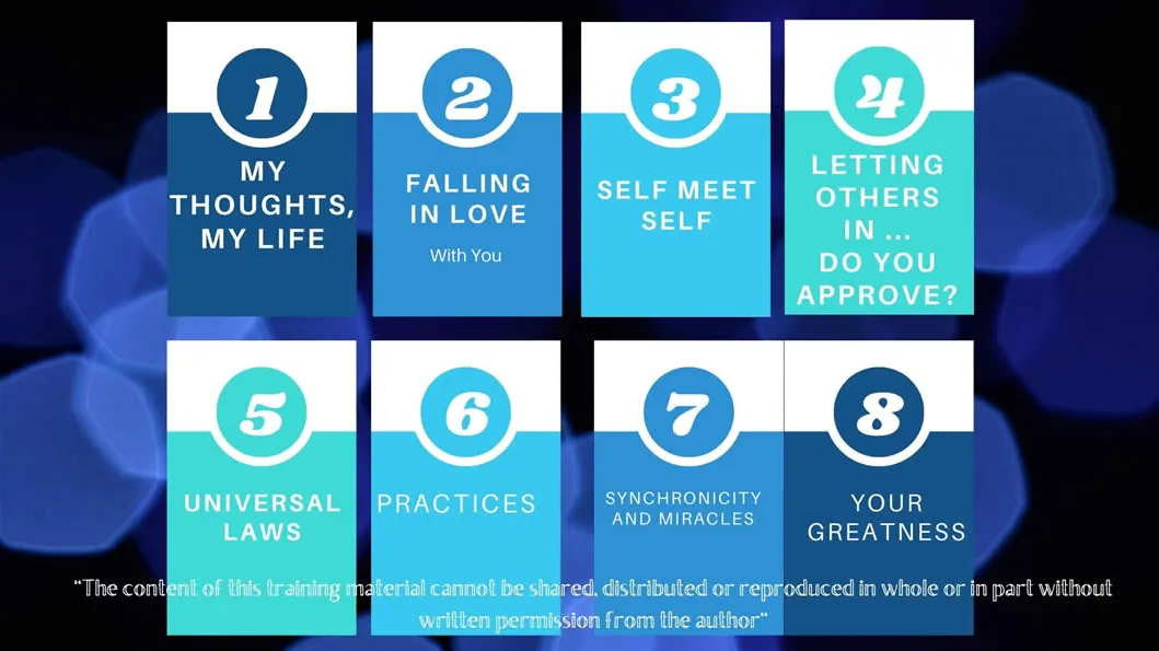 with addressing overwhelm, uncertainty, despair (life tsunamis), and provides concepts and exercises to propel the participants into a journey of self-love, understanding of universal laws, and peace of knowing that the synchronicity of the Universe results in our self-evolution, and greatness.